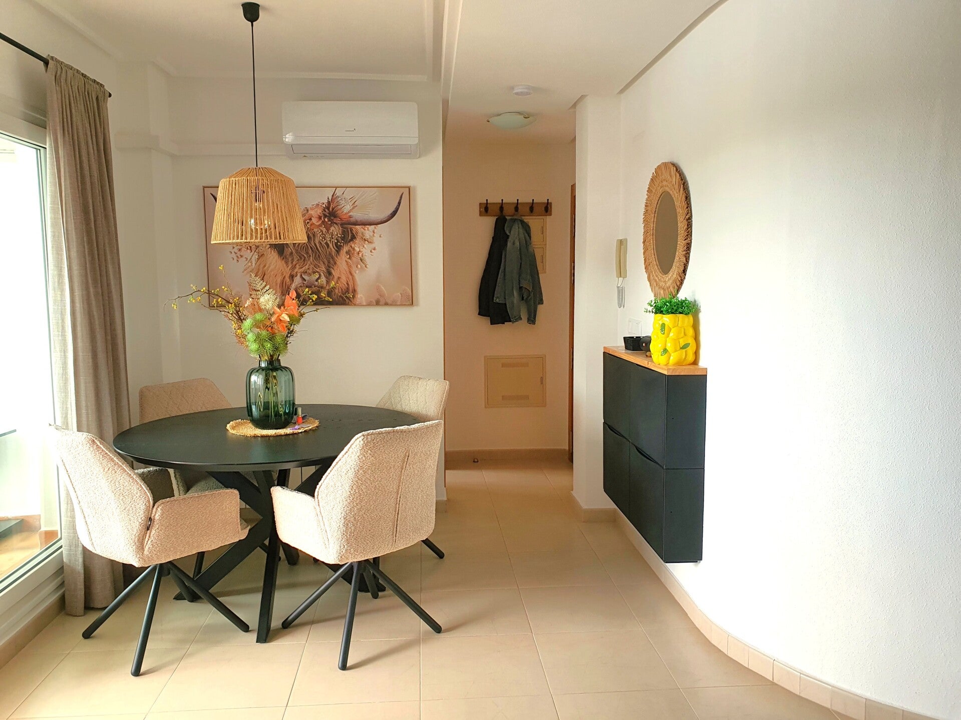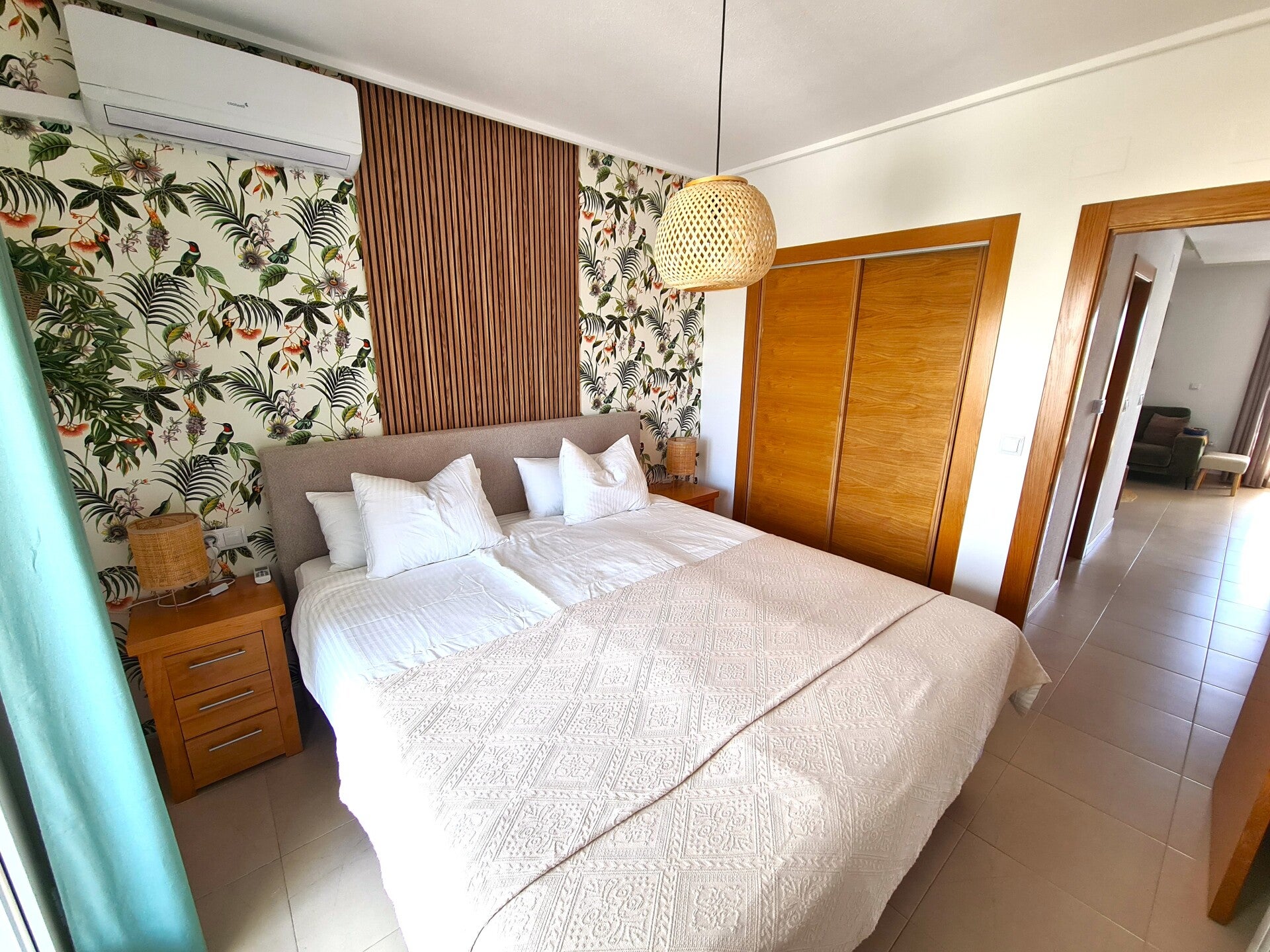 De woonkamer is comfortabel ingericht met een bankstel, salontafel en tv-meubel, daarnaast is er een gezellige eethoek. Het appartement beschikt over televisie met NL zenders en Wifi, voor een aangename temperatuur is er airconditioning aanwezig. De keuken is gescheiden van de woonkamer en uitgerust met apparatuur, waaronder een koelkast, elektrische kookplaat, vaatwasser, magnetron, oven en wasmachine. Alle keukengerei zoals pannen, glazen, bekers, bestek en andere benodigdheden zijn aanwezig. De badkamer is voorzien van een toilet, een wastafelmeubel met verlichte spiegel en inloopdouche. Schone handdoeken liggen klaar in de daarvoor bestemde kast. Het appartement heeft twee slaapkamers, elk heeft een tweepersoons boxspring. Beide slaapkamers zijn voorzien van inbouwkasten en eigen airconditioning, dankzij de rolluiken kunnen de kamers volledig verduisterd worden. Vanuit beide slaapkamers heb je toegang tot een klein balkon met uitzicht op de weg en parkeerplaatsen aan de voorzijde van het resort, aan de achterzijde van het appartement bevindt zich een ruim terras van ongeveer 15 m². Op ons terras kun je heerlijk ontspannen op de loungebank of gezellig dineren aan de tafel met vier stoelen. Vanaf het terras heb je een prachtig uitzicht op het zwembad, de golfbaan en de omliggende natuur, evenals de andere appartementen op het resort.