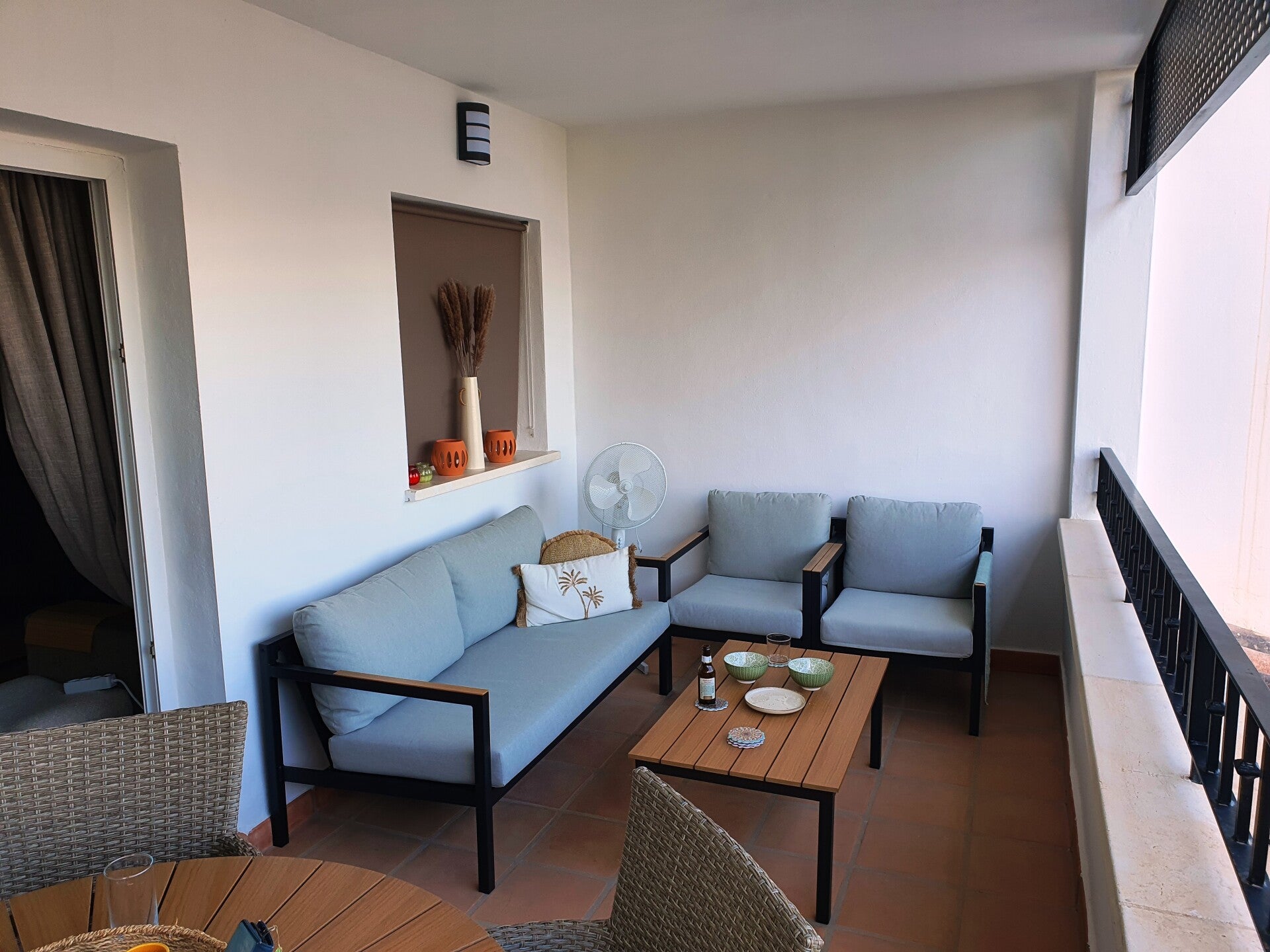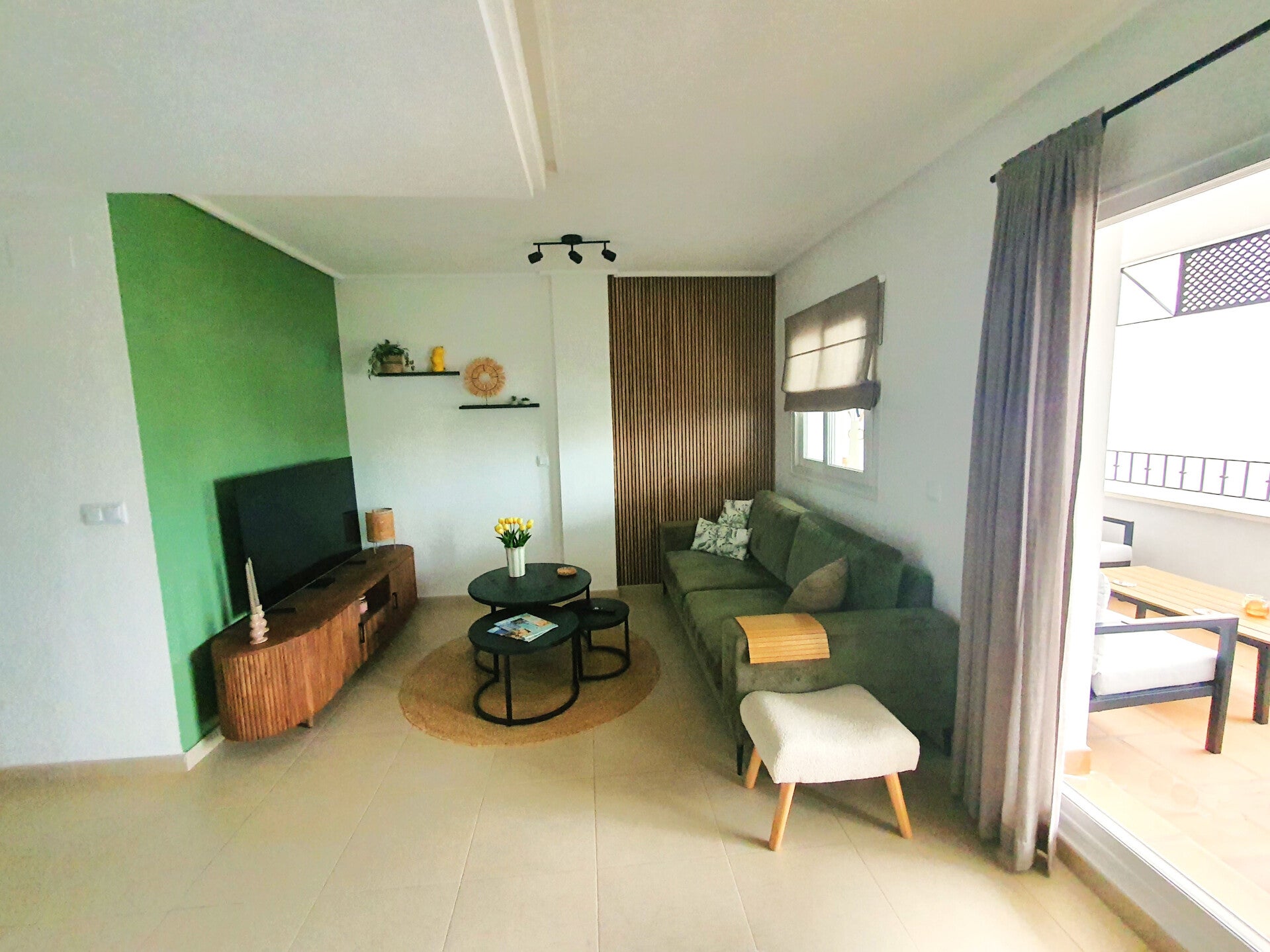 De woonkamer is comfortabel ingericht met een bankstel, salontafel en tv-meubel, daarnaast is er een gezellige eethoek. Het appartement beschikt over televisie met NL zenders en Wifi, voor een aangename temperatuur is er airconditioning aanwezig. De keuken is gescheiden van de woonkamer en uitgerust met apparatuur, waaronder een koelkast, elektrische kookplaat, vaatwasser, magnetron, oven en wasmachine. Alle keukengerei zoals pannen, glazen, bekers, bestek en andere benodigdheden zijn aanwezig. De badkamer is voorzien van een toilet, een wastafelmeubel met verlichte spiegel en inloopdouche. Schone handdoeken liggen klaar in de daarvoor bestemde kast. Het appartement heeft twee slaapkamers, elk heeft een tweepersoons boxspring. Beide slaapkamers zijn voorzien van inbouwkasten en eigen airconditioning, dankzij de rolluiken kunnen de kamers volledig verduisterd worden. Vanuit beide slaapkamers heb je toegang tot een klein balkon met uitzicht op de weg en parkeerplaatsen aan de voorzijde van het resort, aan de achterzijde van het appartement bevindt zich een ruim terras van ongeveer 15 m². Op ons terras kun je heerlijk ontspannen op de loungebank of gezellig dineren aan de tafel met vier stoelen. Vanaf het terras heb je een prachtig uitzicht op het zwembad, de golfbaan en de omliggende natuur, evenals de andere appartementen van het resort.